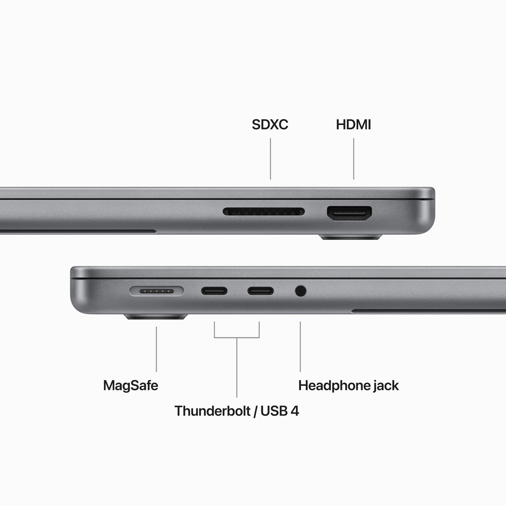 Le MacBook Pro offre toute une série de ports pour brancher des périphériques haut débit, connecter des écrans haute résolution ou effectuer directement l’offloading des cartes SDXC. De plus, il prend en charge le Wi‑Fi 6E et le Bluetooth 5.3.